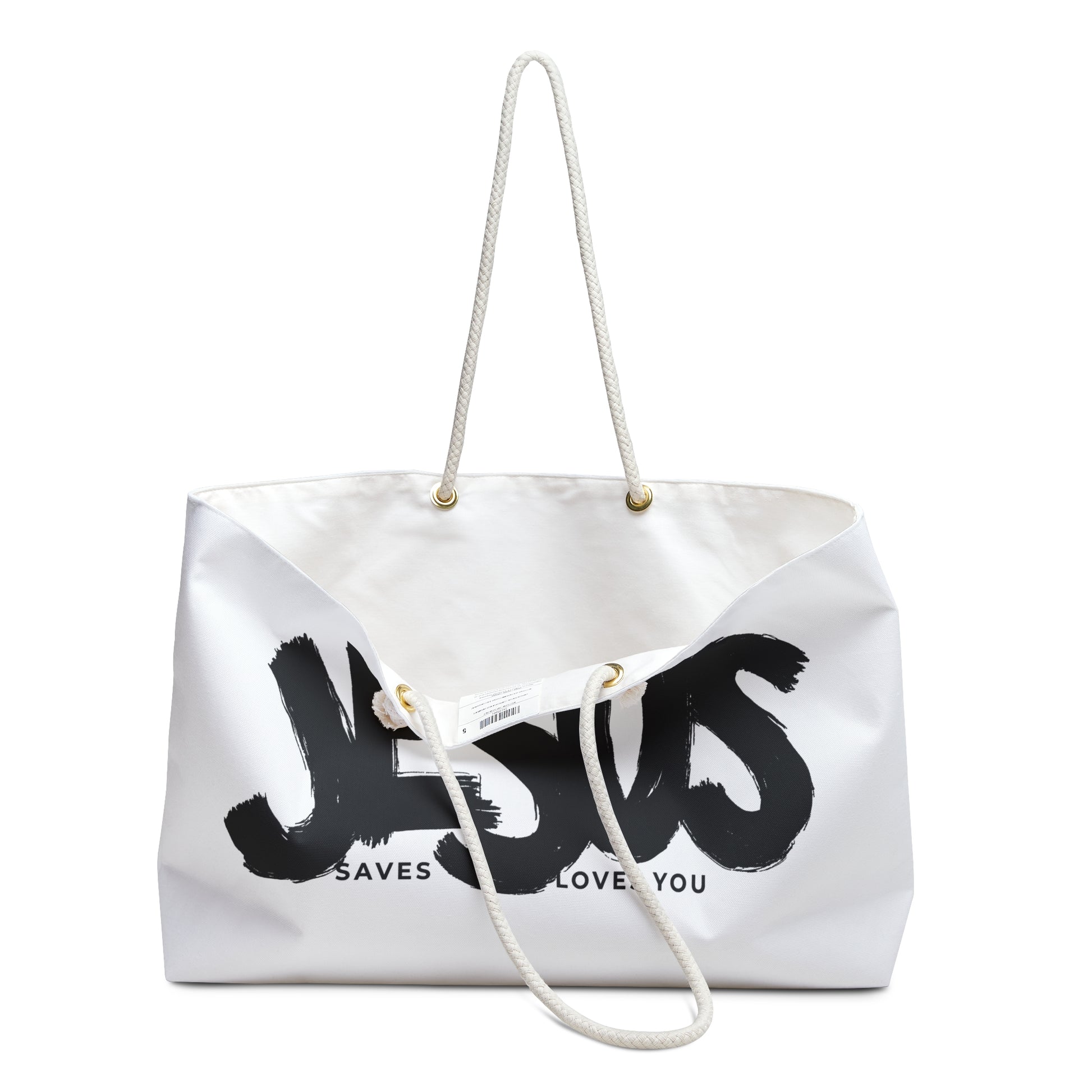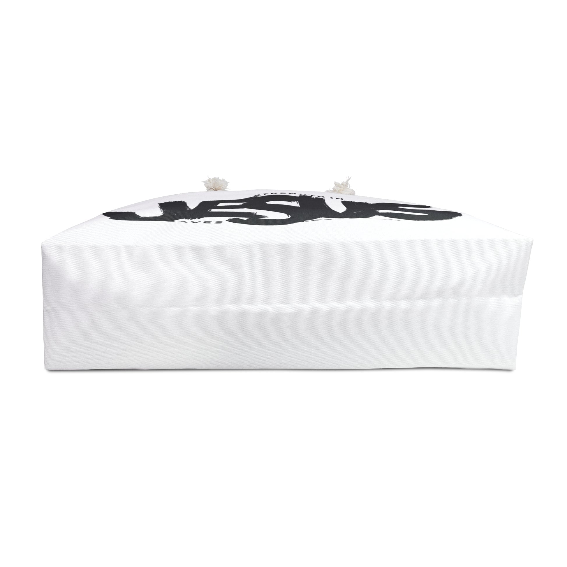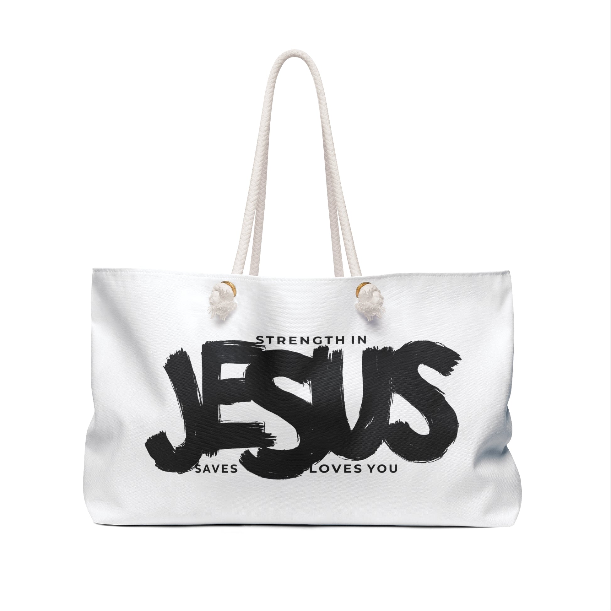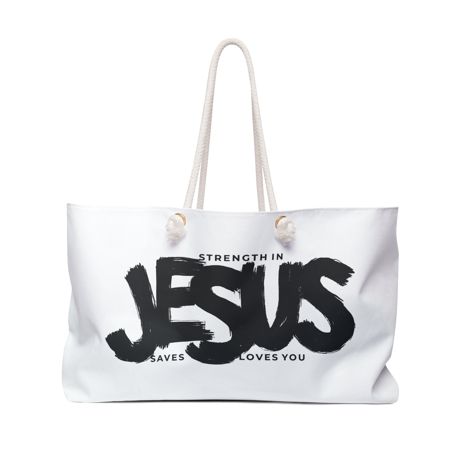 Embrace the divine power with our oversized Weekender Tote featuring three impactful messages in one: 'Strength in Jesus,' 'Jesus Saves,' and 'Jesus Loves You.' This spacious tote is not just your ordinary bag; it's a statement of faith and devotion. Whether you're heading for a weekend getaway at the beach or exploring the city, this durable tote is designed to accommodate all your essentials with ease. Crafted from 100% Spun Polyester, it boasts a cream sheeting interior lining and sturdy rope handles for comfortable carrying. With its generous size of 24" x 13", this tote ensures you're always prepared for your next adventure. Experience divine strength and love wherever you go with this exceptional Weekender Bag.