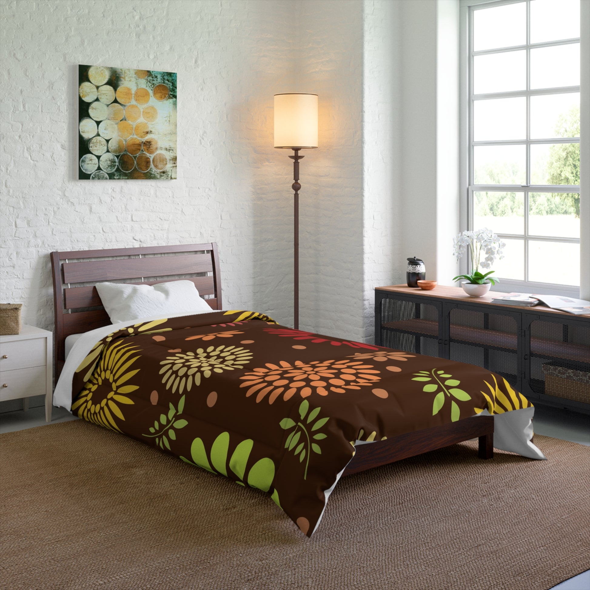 Embrace the serene beauty of nature with our Earthy Elegance Brown Floral Pattern Polyester Comforter. Crafted for ultimate comfort and style, this luxurious comforter envelops you in warmth and relaxation for a rejuvenating sleep experience. Made from 100% polyester, it offers a lightweight yet cozy feel, perfect for snuggling up on chilly nights. The earthy brown floral pattern adds a touch of elegance to your bedroom decor, while the solid bright white back enhances the visual appeal. With its one-sided print, this comforter is a statement piece that exudes sophistication and charm. Whether you're enjoying a lazy morning with coffee or unwinding after a long day, our Earthy Elegance Comforter is the perfect companion for creating a cozy sanctuary in your home.