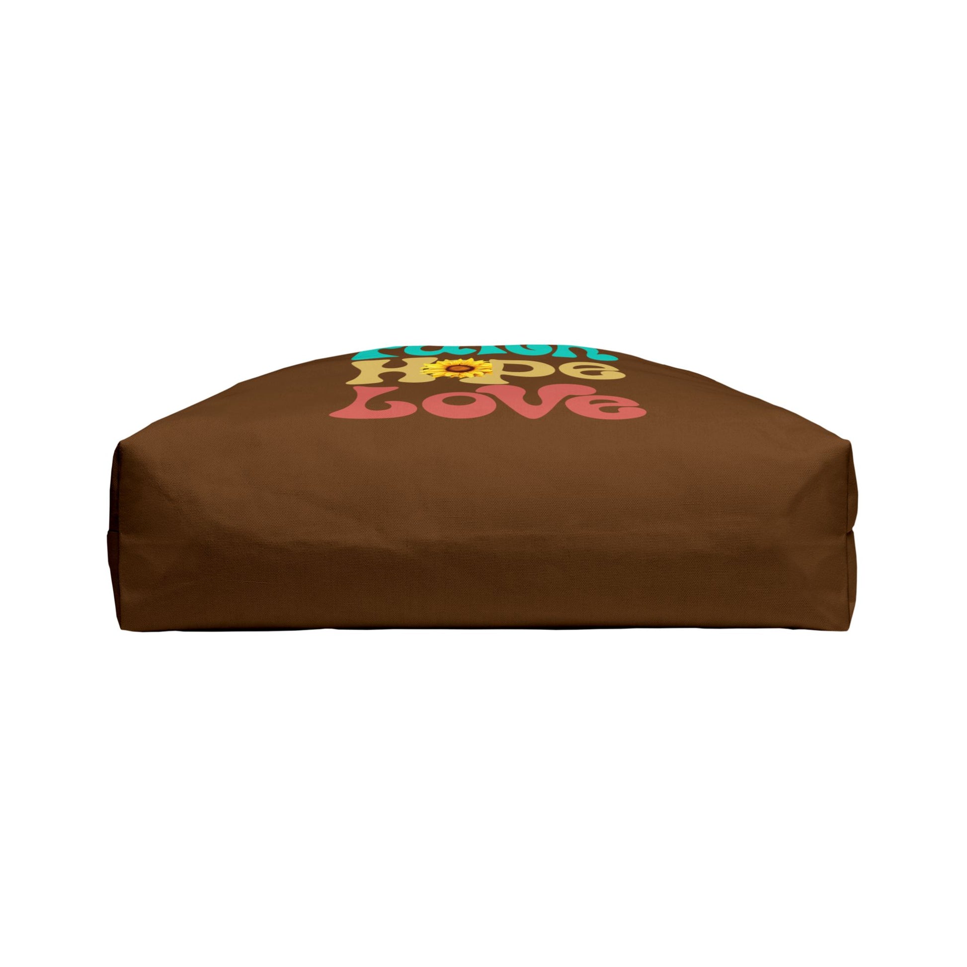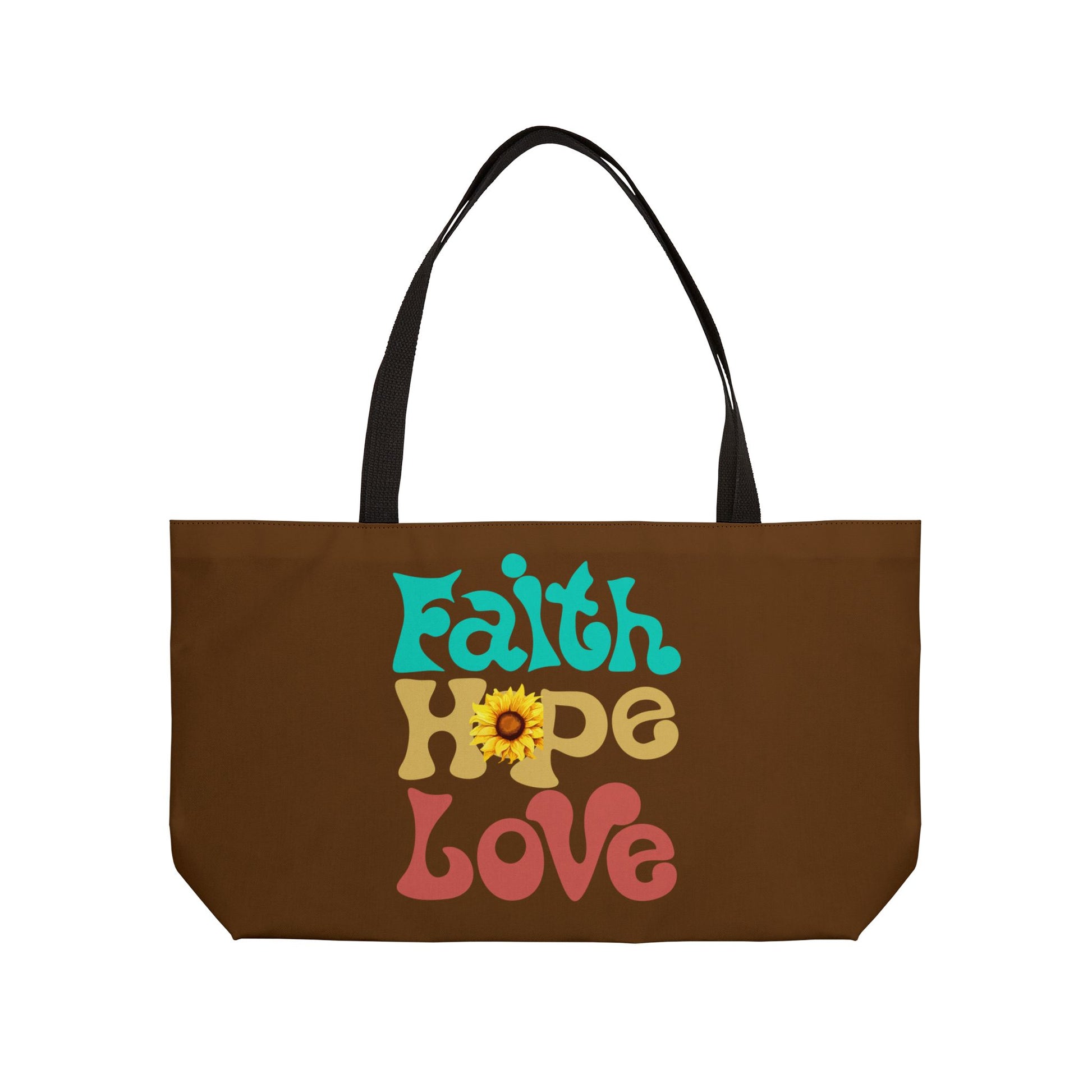This Faith, Hope, and Love Weekender Tote Bag comes in one size – 24" x 13" (60.9 cm x 33 cm) – perfect for those who love to travel light. Its t-bottom construction and black handles give it a sleek, classic look. Start designing, and we'll print your art on the 100% spun polyester in vibrant colors.