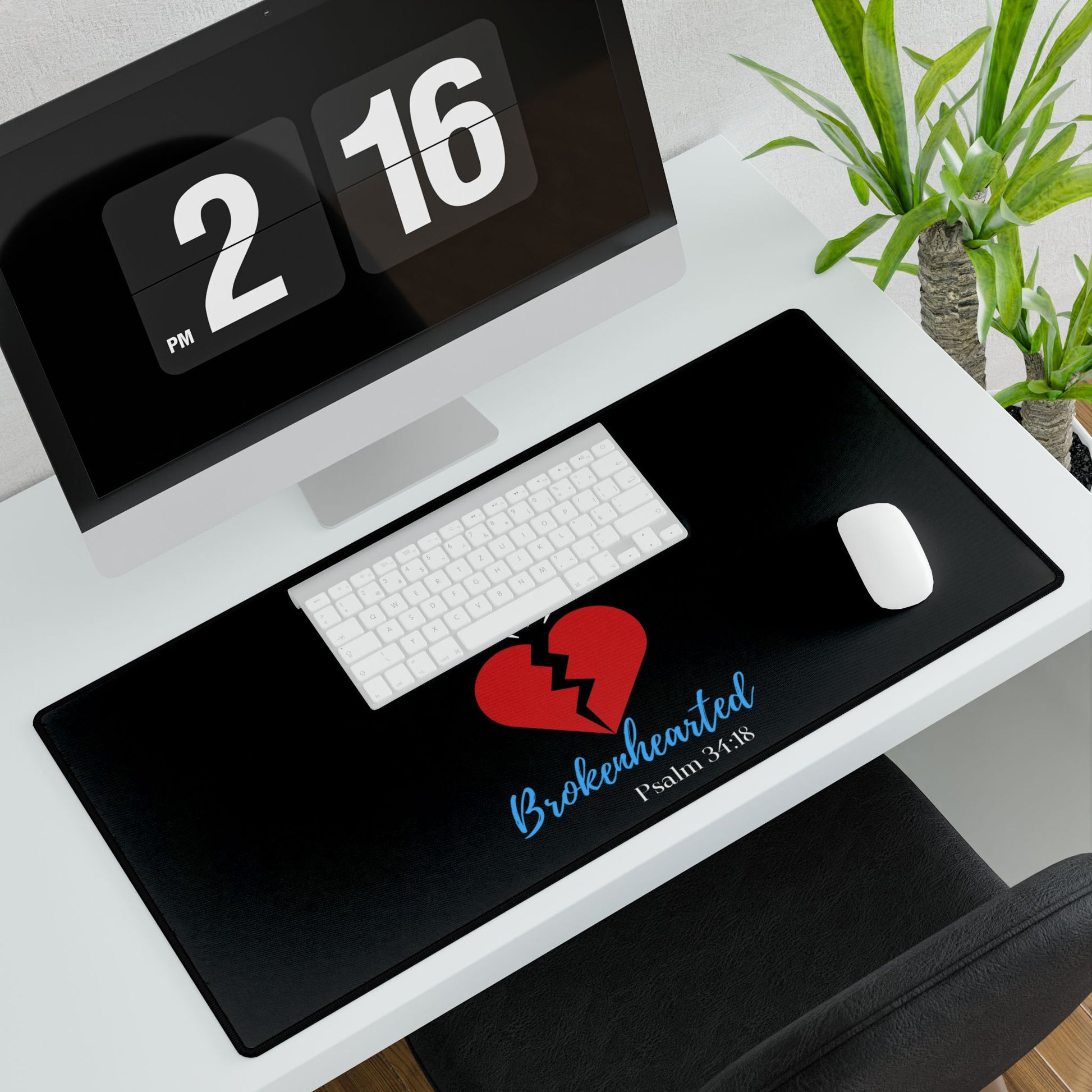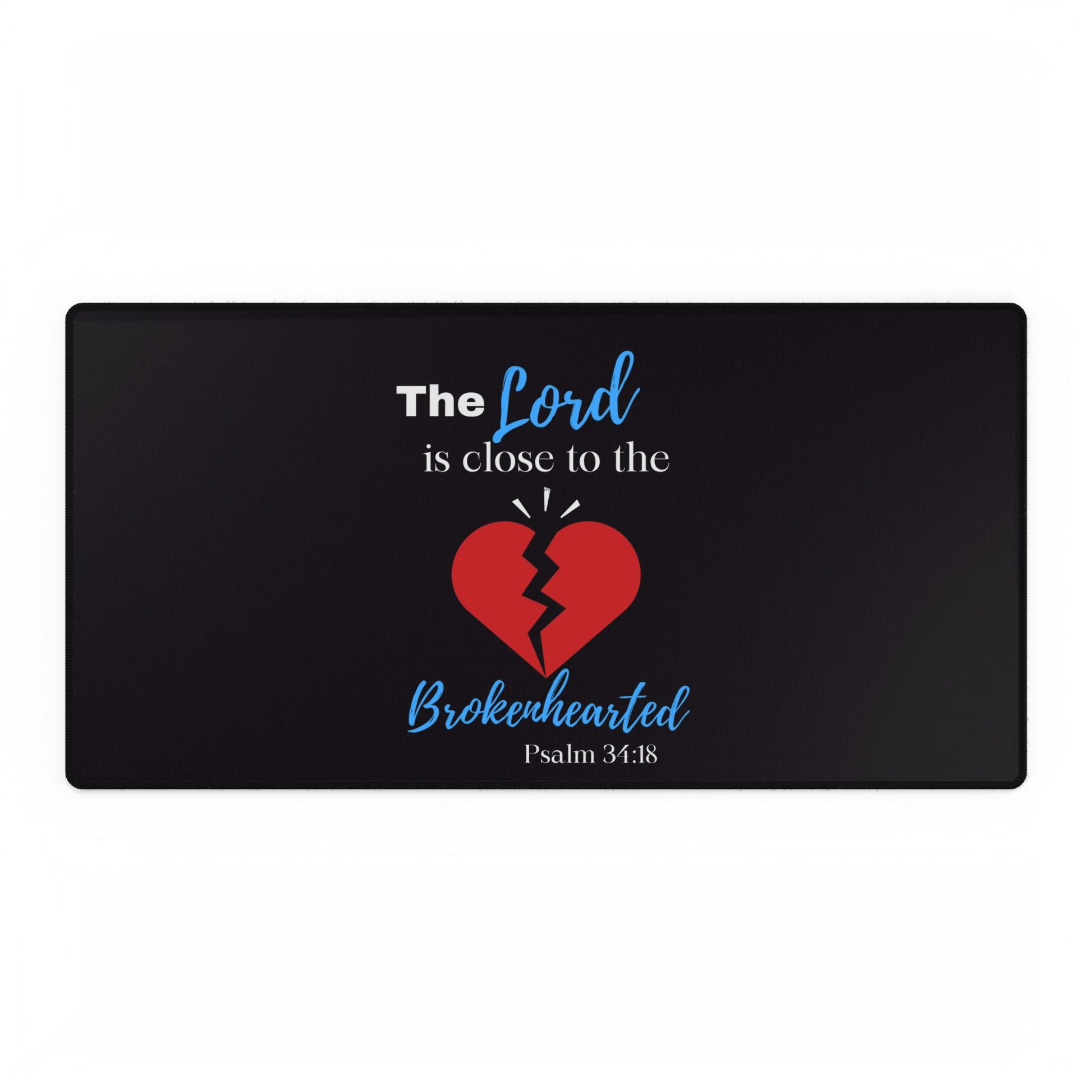 Experience both comfort and style with our Psalm 34:18 mouse pad. Not only does it look cool, but it also protects surfaces from scratches and stains. Ideal for organizing your space with minimal effort, these mats feature a smooth surface and a non-slip base. Crafted for durability, they will last long without fraying or pilling. Plus, they support optical and laser mice, ensuring a seamless and comfortable workspace. Elevate your desk area with this functional and inspirational desk pad.