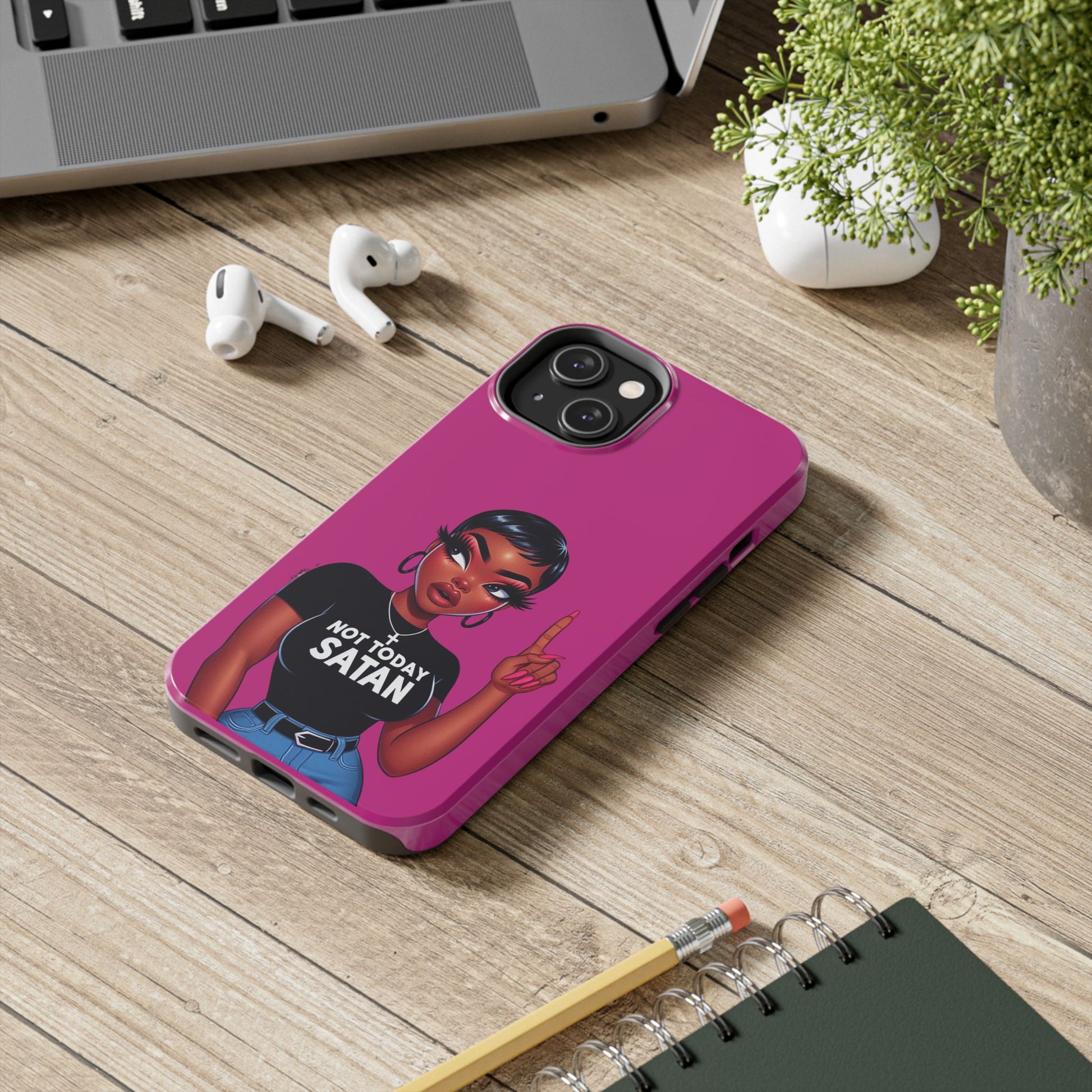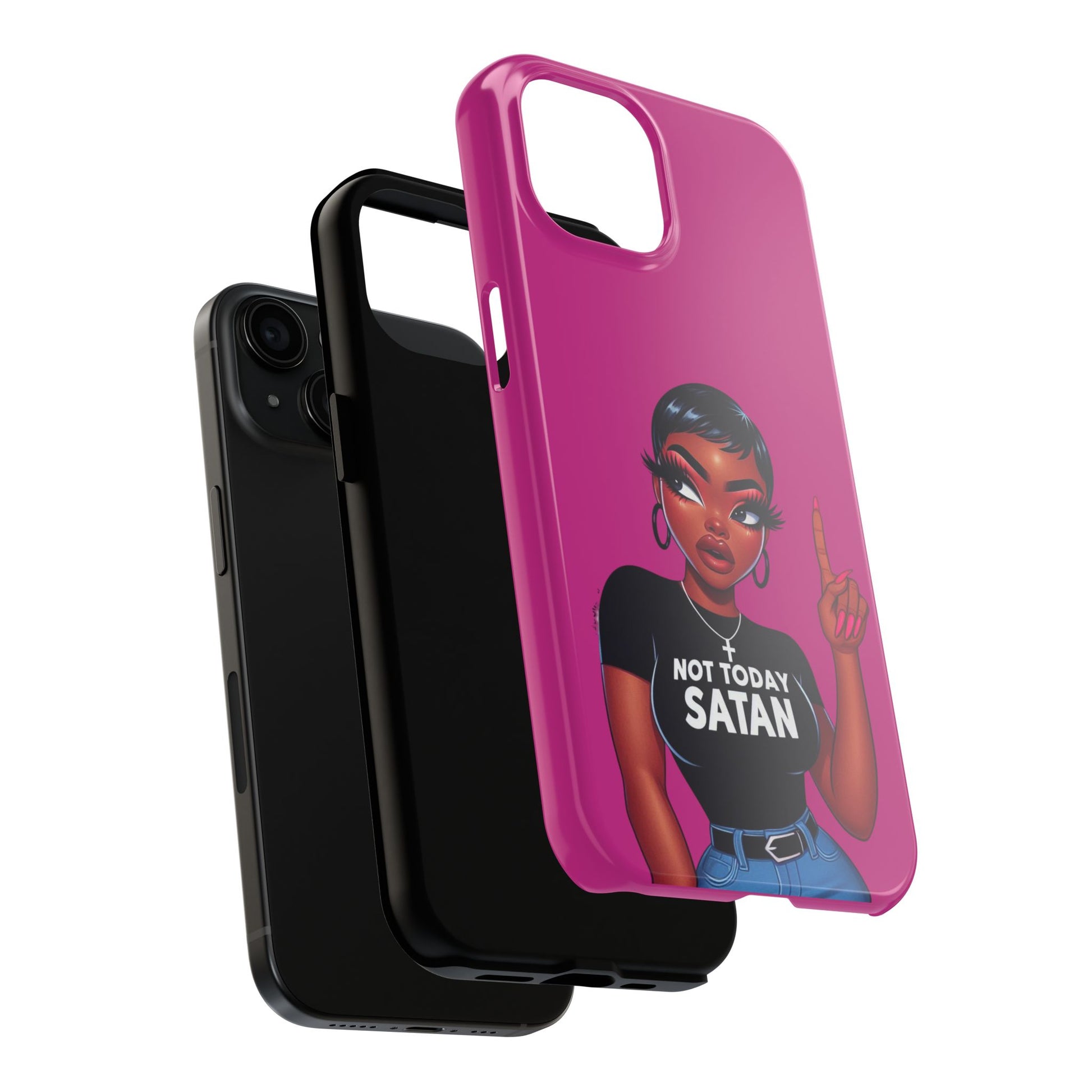 Defend your phone with style using the 'Not Today Satan' Tough Phone Case. This lightweight yet resilient case combines a durable polycarbonate shell with a shock-absorbing TPU lining to offer excellent impact resistance. The interior rubber liner provides an extra layer of protection, ensuring your device stays safe from everyday bumps and drops. Designed to fit both iPhone and Samsung models, this case offers peace of mind without compromising on style. Check for available sizes to match your specific phone model.